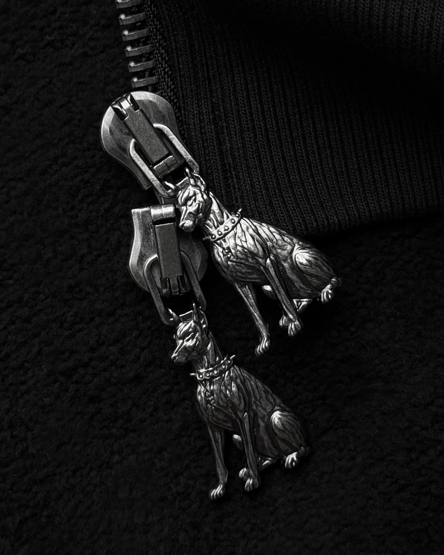 - Double two-way antique silver dobermann zip puller.